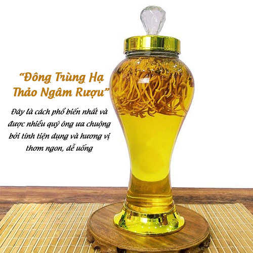 Đông trùng hạ thảo tươi nuôi cấy trên cơ chất tổng hợp, kết hợp rượu nếp cái hoa vàng.