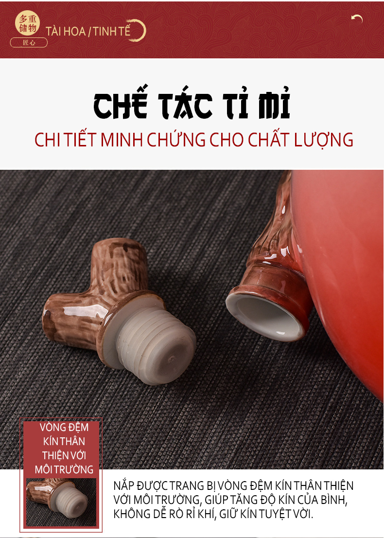 Cụ thể, sản phẩm này kết hợp hoàn hảo giữa nghệ thuật thiết kế và chất lượng rượu cao cấp , tạo nên một tác phẩm nghệ thuật có giá trị sưu tầm và sử dụng. Thiết kế tinh xảo với hình dáng quả đào tiên không chỉ mang tính thẩm mỹ cao mà còn chứa đựng ý nghĩa phong thủy sâu sắc về trường thọ, may mắn và thịnh vượng. Đồng thời, rượu bên trong được sản xuất theo quy trình truyền thống với nguyên liệu cao lương hảo hạng và men tự nhiên, tạo nên hương vị đặc trưng với mùi thảo mộc tự nhiên và vị êm hậu sâu đặc biệt phù hợp cho người sành rượu.